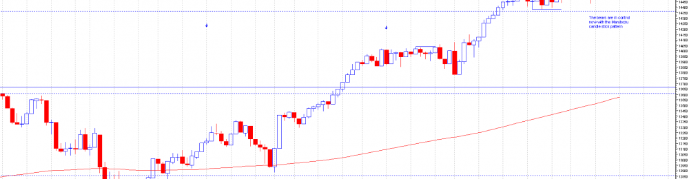 Marubozu candlestick pattern on the dow. This is quite a rare pattern on the dow jones industrial.This shows that the bears are in charge and bigger falls maybe about to come.Go away in april and come back in october may be true this year.A good entry based on this pattern is if the price comes half way up the Marubozu in this case to 14731(this is th 50% point of the Marubuzu) then short with stops above preferably.Caution on new longs as this could be the signal for a top. Obviously if the price goes back above the Marubozu then its void.
