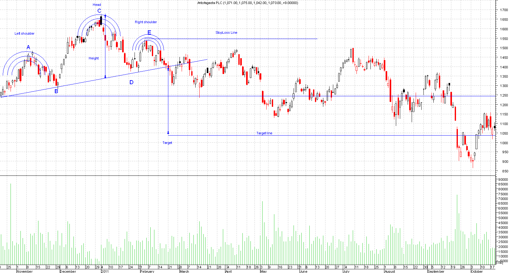 The build up of the left shoulder maybe accompanied by higher than normal volume, point A, then a retrace point B, this will normally be of low volume.