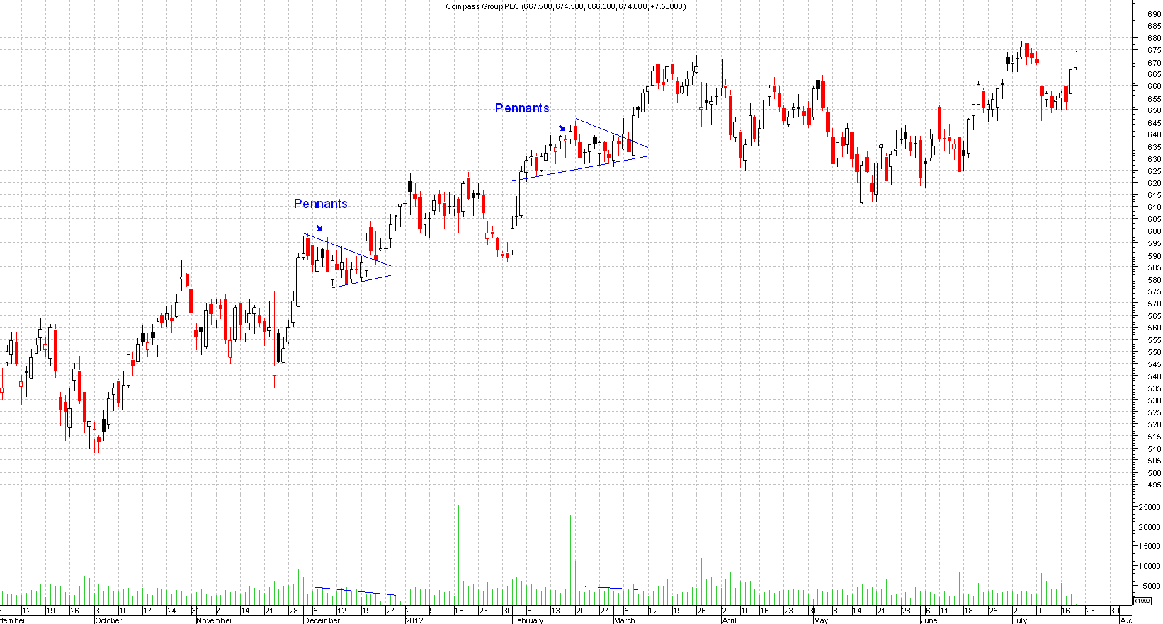 The Pennants only take 1-2 weeks to build where as a symmetrical triangle could take from 1 month to 3 months to build.