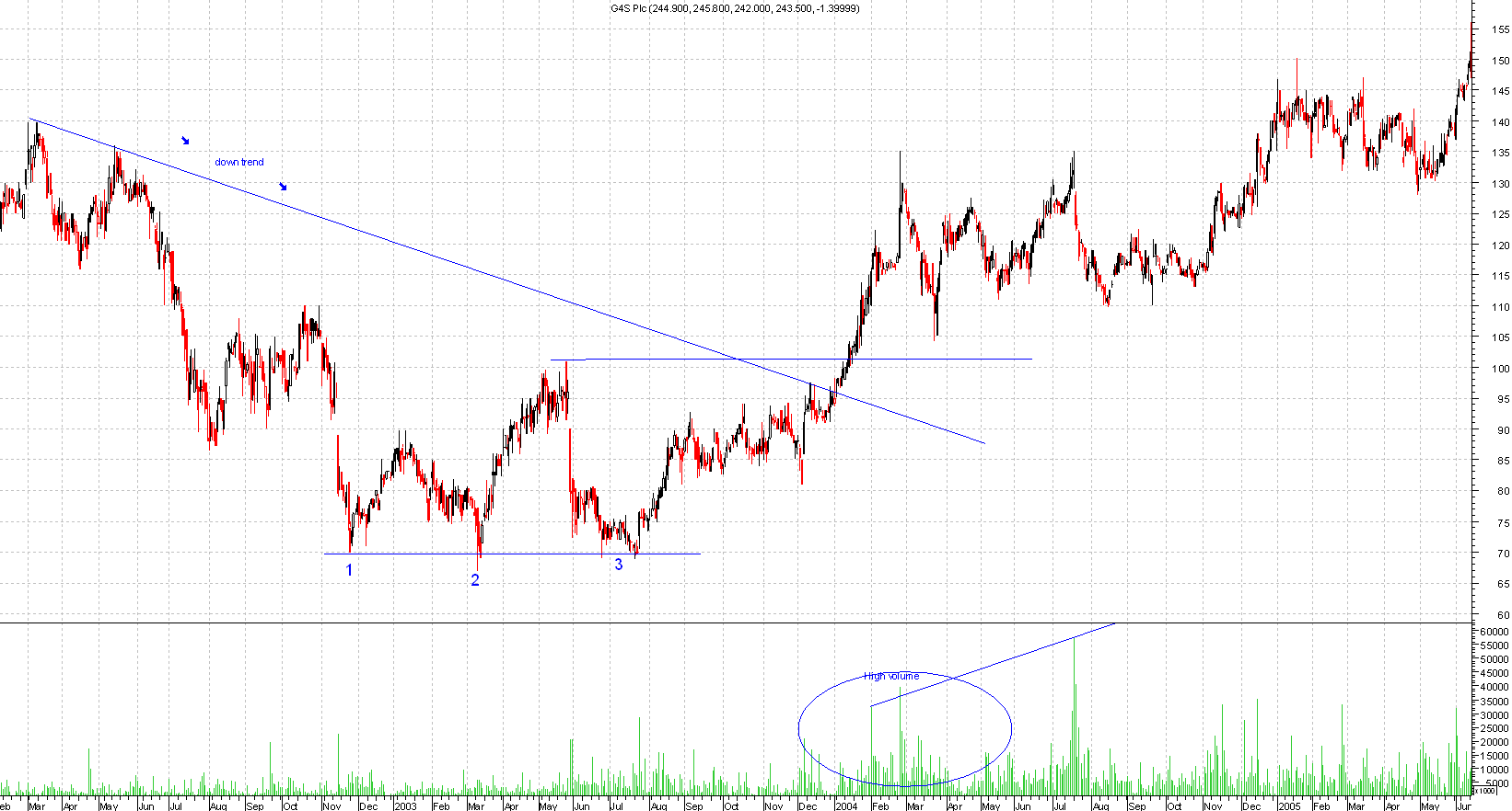 The share price bounces of roughly the same low three times and once the peak resistance is broken then you get the buy signal, which should be followed by high volume.